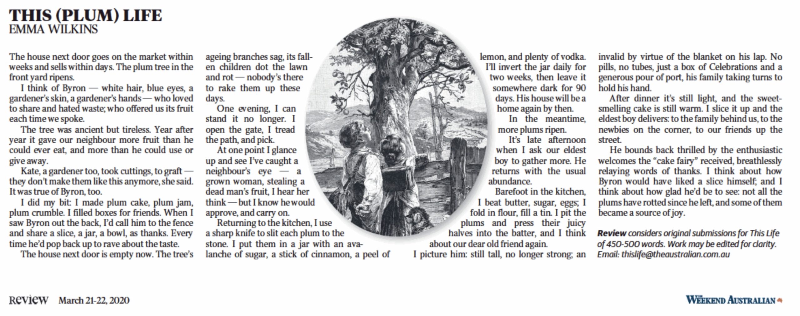 I did my bit: I made plum cake, plum jam, plum crumble. I filled boxes for friends. When I saw Byron out the back, I’d call him to the fence and share a slice, a jar, a bowl, as thanks. Every time he’d pop back up to rave about the taste.